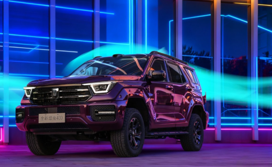 外觀方面,新車采用窄條幅六邊形前格柵,內部輔以兩條橫向鍍鉻飾條,中央則為坦克品牌LOGO,搭配兩側多邊形大燈組,給人一種強烈的硬派氣息。此外,全新坦克400還特別推出了一款“敦煌紫”配色,采用5微米紫色珠光粉噴涂而成,質感及細膩程度都顯得很上檔次,全新配色賦予車身更加年輕、運動和活力的視覺感受。