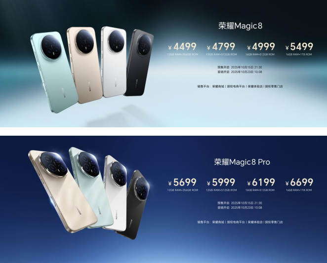 榮耀Magic8系列已于10月15日正式發(fā)布,并在10月23日在榮耀官方渠道及合作平臺啟售。榮耀Magic8標(biāo)準(zhǔn)版配備旭日金、天青釉、雪域白、絨黑色,售價4499元起;榮耀Magic8 Pro配備旭日金砂、天青色、雪域白、絨黑色,售價5699元起。