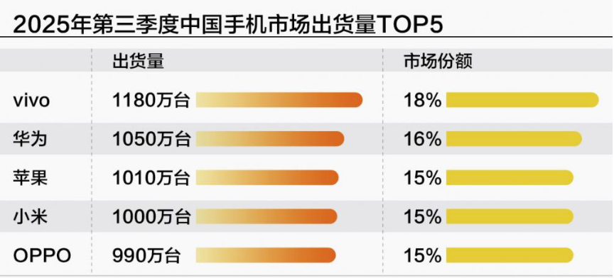 再看國內市場,Omdia數據顯示,三季度中國大陸智能手機市場同比下降3%。但結構調整加速、競爭格局重塑,vivo重返第一,華為已經攀升到第二,行業正從“量的競爭”邁向“質的升級”。